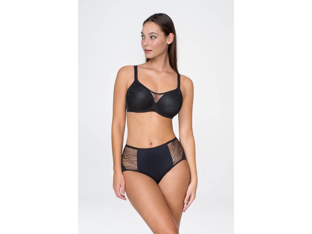 Vyztužené bezešvé košíčky jsou potaženy jemným elastickým tylem, který překrývá vykrojení ve středu podprsenky. Nabízí tak hluboký dekolt, ale zároveň udrží prsa díky průhlednému překrytí tylem na svém místě.