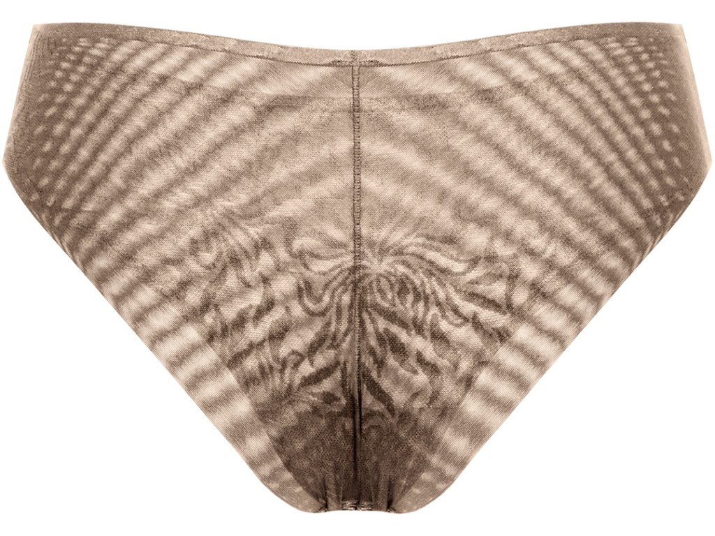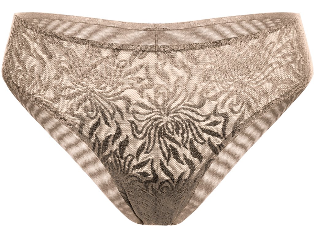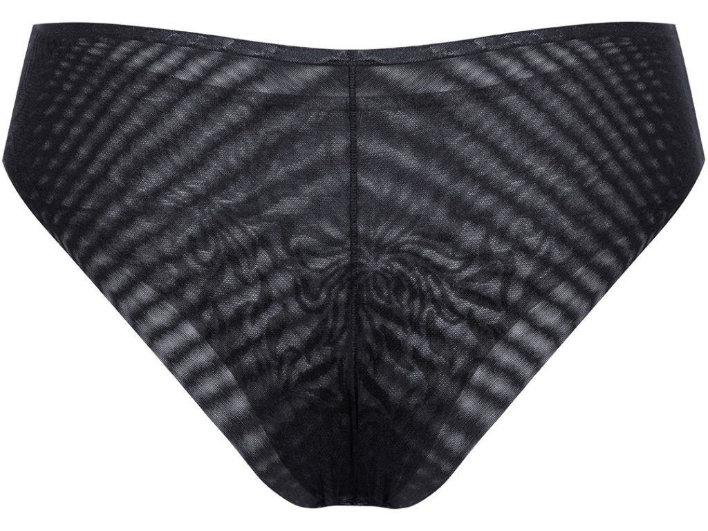 Přední část brazilských slipů do středního pasu je z celoplošné krajky a zadní část z dvojitě zahnuté síťoviny