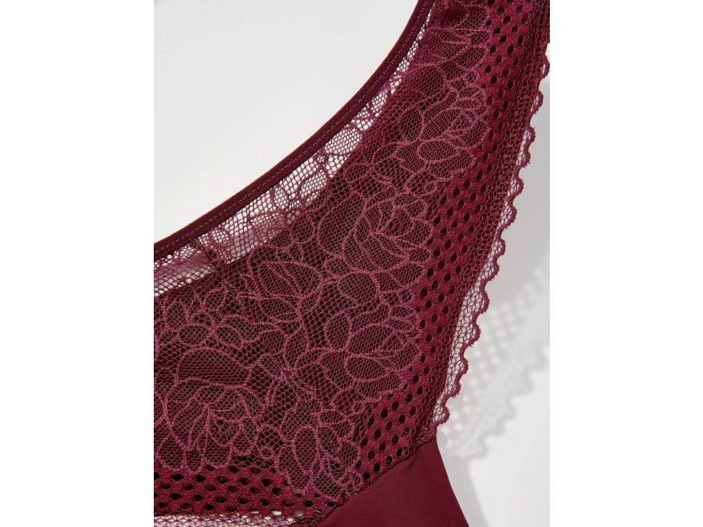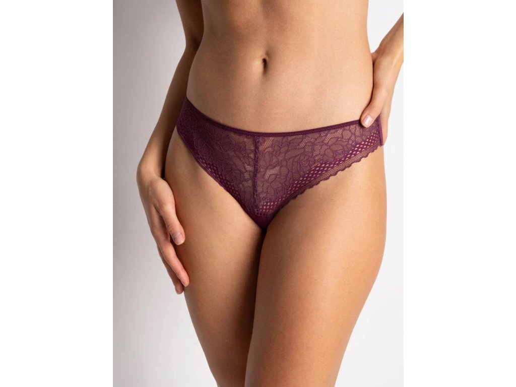 Oblíbené detaily: tanga s přední částí z krajky, kontrastní grafickou a lehce prolamovanou úpravou stehen,
