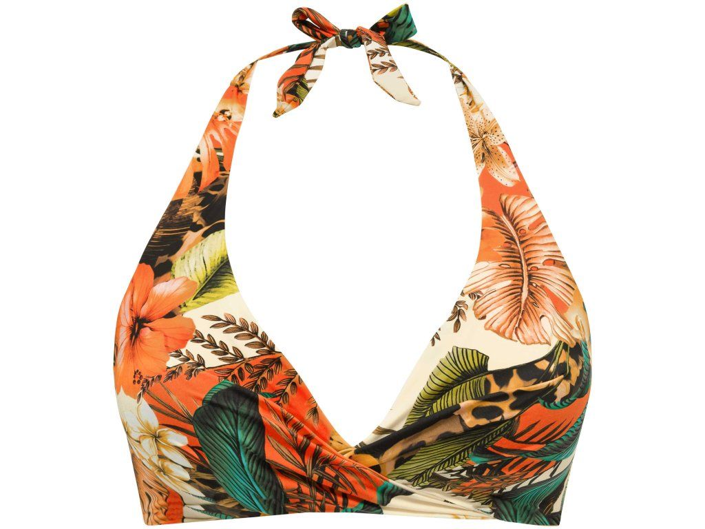Plavková podprsenka bez kostic a bez pevné výztuže, s překříženým (wrap) efektem pro přirozené tvarování poprsí.“