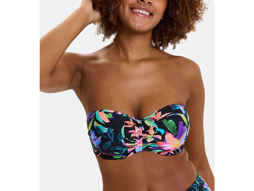 Dvoudílné dámské plavky s tropickým vzorem, kde horní díl s kosticemi poskytuje dobrou oporu poprsí a spodní díl má vyšší elegantní střih, který lichotí postavě.