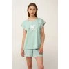 Top s krátkými rukávy zdobí roztomilý potisk pejska na hrudi, který dodává hravý a okouzlující akcent, zatímco kraťasy jsou ozdobeny nadčasovým zeleno-bílým potiskem.
