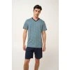 Tričko zdobí rytmický geometrický potisk v chladných modrých tónech, oživený akcenty v tyrkysově modré barvě, který vytváří čistý a moderní grafický vzhled, zatímco krátké kalhoty zůstávají jednobarevné, aby byl celkový dojem vyvážený.