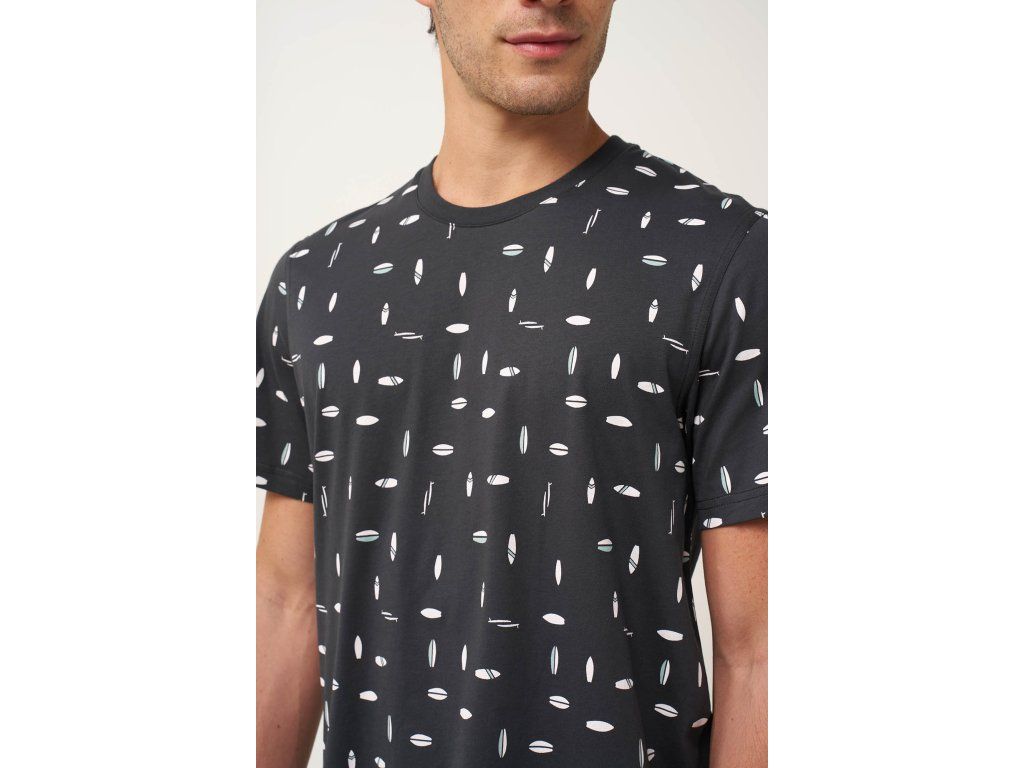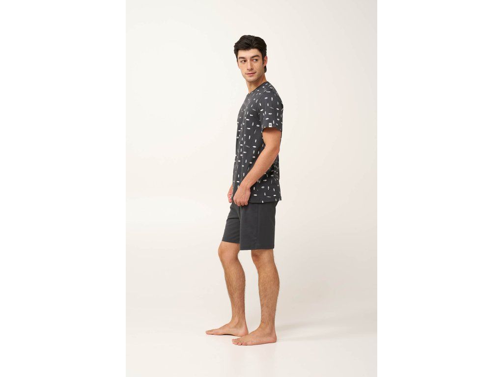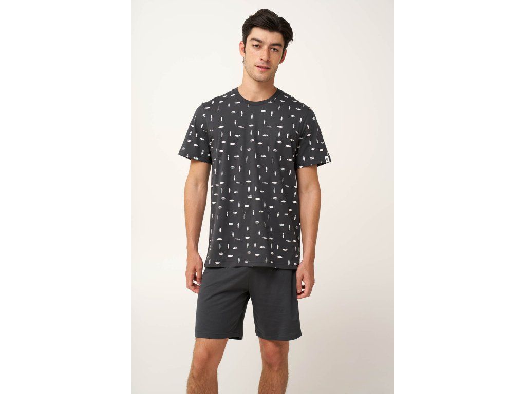 Tričko s kulatým výstřihem zdobí výrazné minimalistické siluety surfových prken, inspirované pobřežním stylem, které dodávají moderní grafický nádech. Krátké kalhoty v tmavě šedé barvě dokonale doplňují čistý a vyvážený vzhled soupravy, přičemž umožňují volný pohyb a každodenní pohodlí.